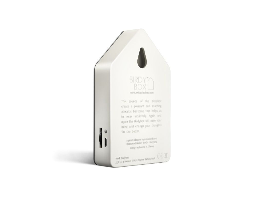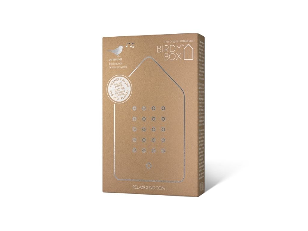 Our Birdybox relaxes from the very moment you hear it. The soothing natural sounds bring you to a forest clearing filled with the happy chirping of birds, where the twittering makes you relax intuitively and feel pleasantly liberated. The Birdybox doesnƒ??t need much time to do this: just 20 seconds.