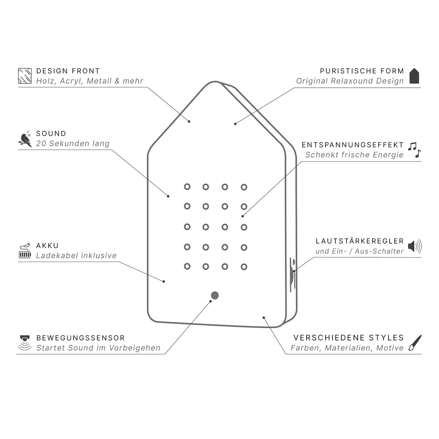 Thanks to the motion detector, the refreshing natural sounds are activated simply by passing by. The volume is individually adjustable, while the compact size and practical battery operation mean you can enjoy the effect of the Birdybox anywhere. Whether on the coffee machine, bookshelf, desk or window ledge: a moment of relaxation is welcome everywhere.